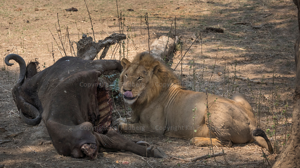 Lions (number four of the Big Five) feed on buffalos and defend their catch if one comes too close.