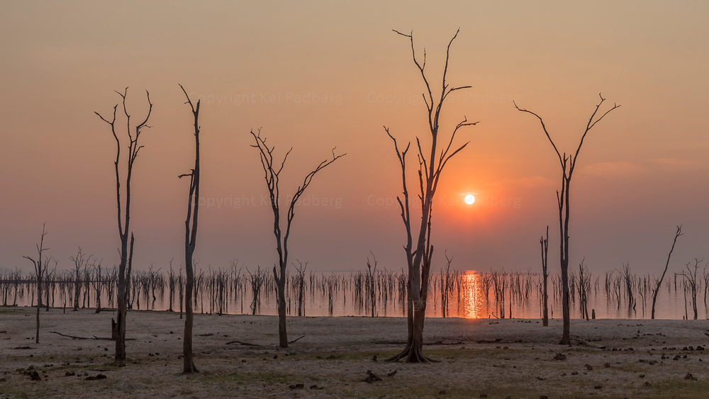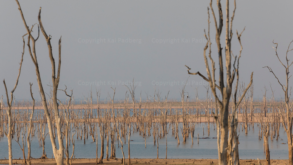 Dammed up Zambezi River builds Lake Kariba. A long lasting dry period reveals the sunken trunks.