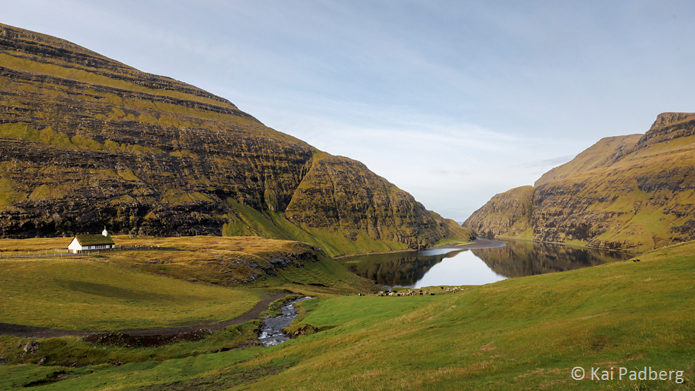 An old path leads over the mountain from Tjørnuvík to Saksun. This has also been used to transport the disassembled elements of Tjørnuvík’s old church to the sand blocked Atlantic inlet for reconstruction. An open air museum has been implemented, too. Friendly signs ask the many visiting tourists to keep off the grass providing feed for the grazing sheep.