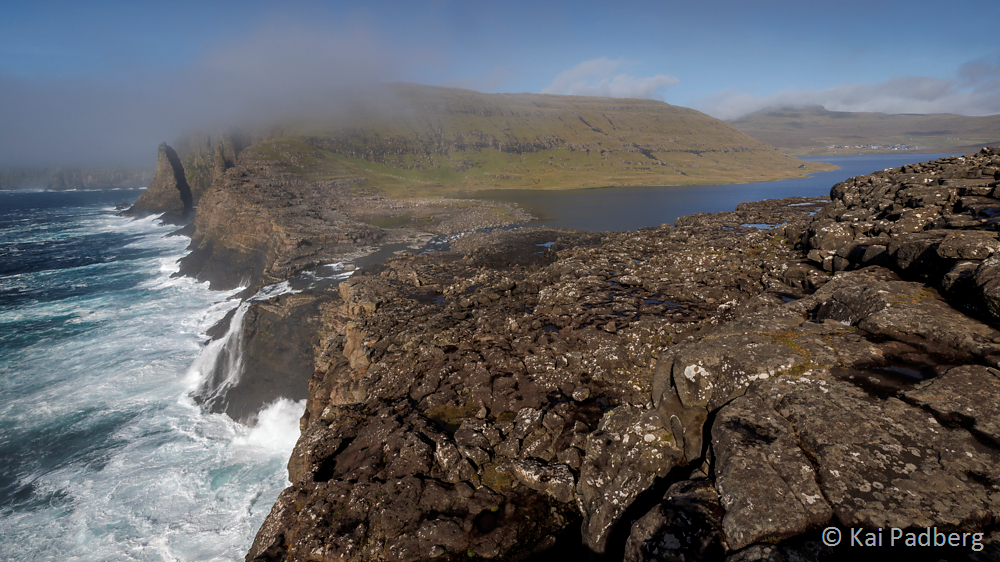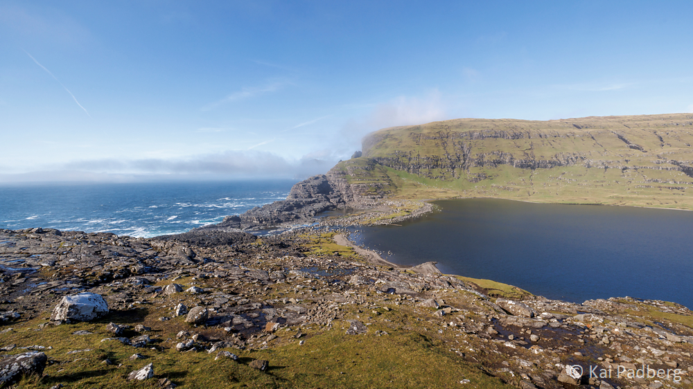 At it’s southern banks Bøsdalafossur waterfall drains the also called “lake above the ocean”. From a height of about 30 m the water falls down to see level into the Atlantic.
