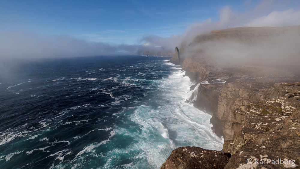 In an instant the water falls down 140 m at Fossurin í Fossá, one of the highest waterfalls in the Faroe Islands.