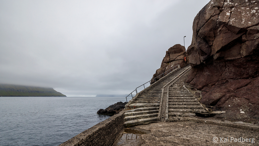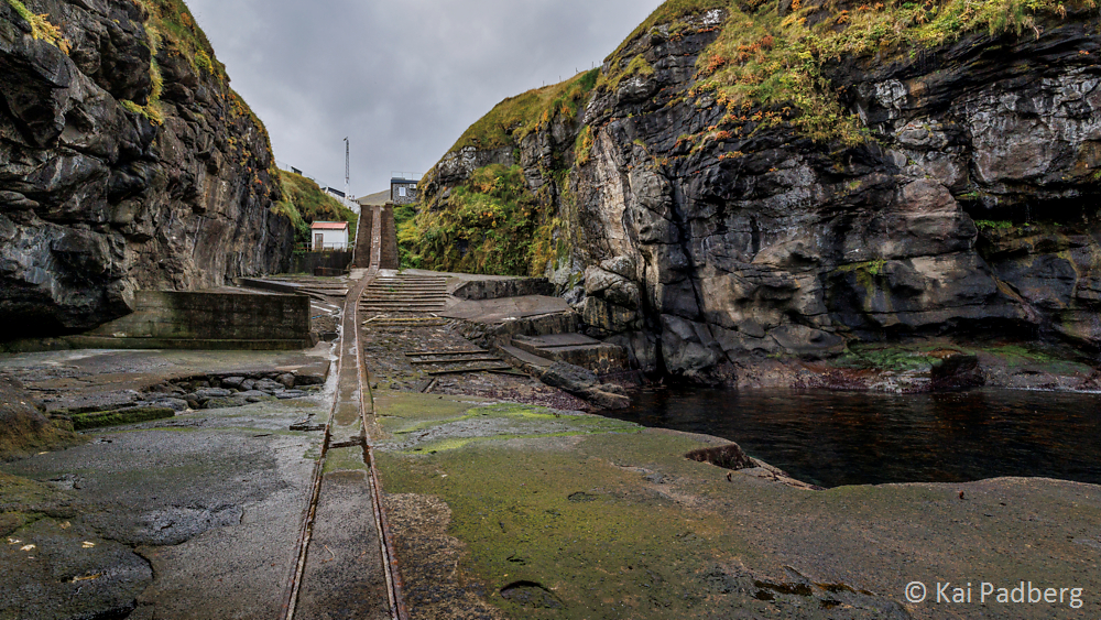 The deep gorge at Gjógv provides shelter for fisher boats as a natural harbour. If waves still find their way into the harbour the boats can be winched up high onto the cliffs. Rails support the steep slipway.