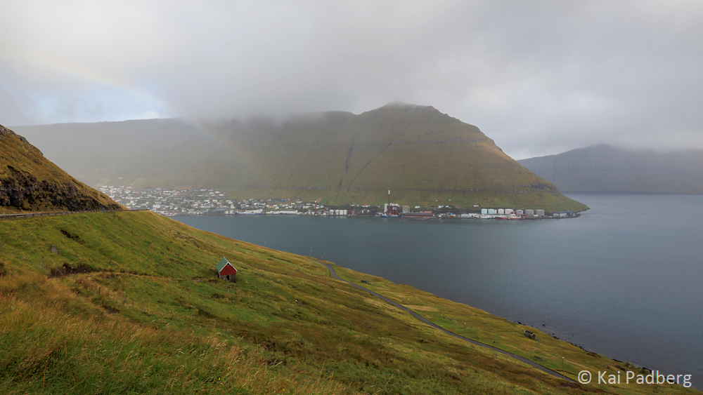 Fuglafjørður is highlighted by a rainbow.