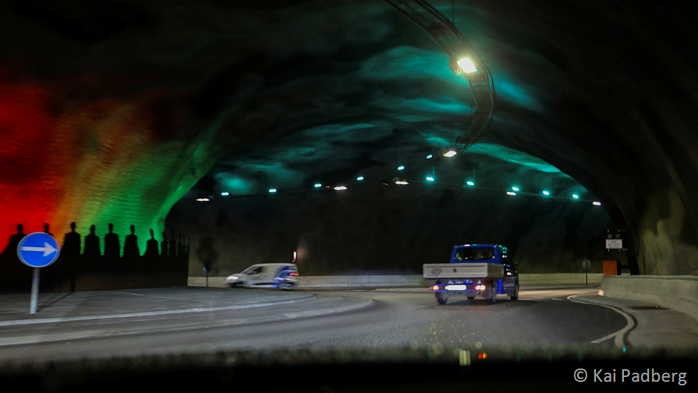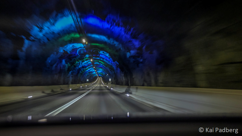 In 2024 21 tunnels are in operation linking islands together under the sea. The oldest one dates from 1961. Single lane roads with passing places lead through theses old pitch black tunnels. The newer ones house illuminated double lane roads. Blue and green light installations mark the middle of the tunnel at the deepest point.